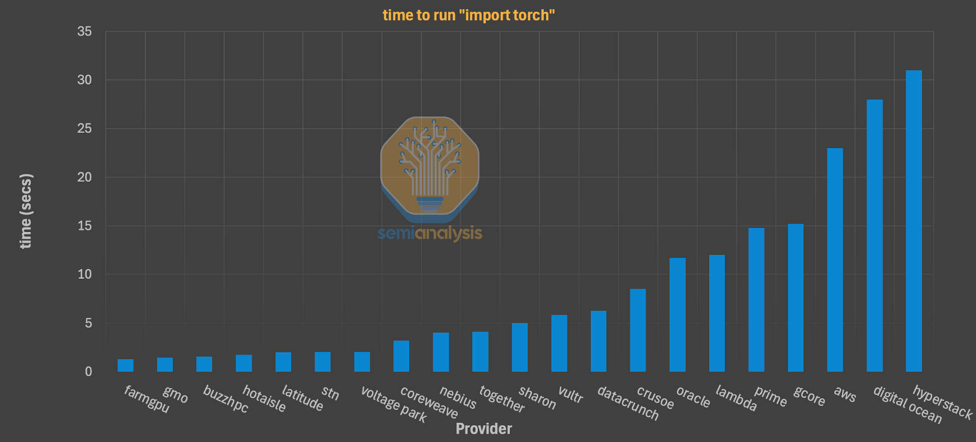 「GMO GPUクラウド」は、SemiAnalysis社による実測テストにおいて、主要GPUクラウドプロバイダーの中でPyTorch(※1)ライブラリの起動時間が約1秒と、最速クラス(※2)のパフォーマンス結果となりました。この結果は、適切なシステム構成と最適化された開発環境を示す重要な指標となります。