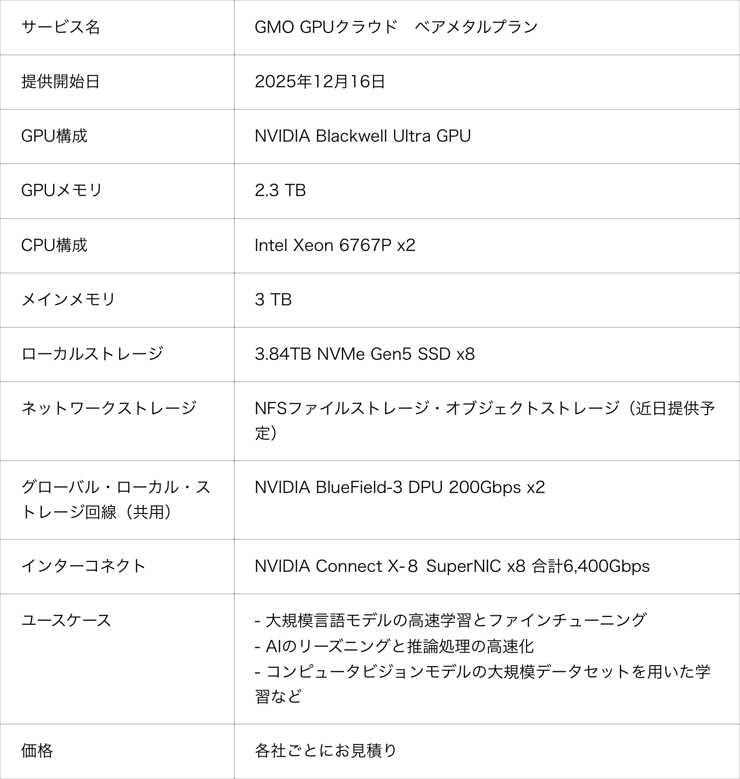 GMOインターネットグループの、GMOインターネット株式会社(代表取締役 社長執行役員:伊藤 正 以下、GMOインターネット)は、NVIDIAテクノロジで構築した高性能GPUクラウドサービス「GMO GPUクラウド」において、「NVIDIA Blackwell Ultra GPU」(URL: https://www.nvidia.com/ja-jp/data-center/technologies/blackwell-architecture/)を搭載した「NVIDIA HGX B300 AI インフラストラクチャ(以下、HGX B300)」を導入したクラウドサービスを、2025年12月16日(火)より国内最速クラスで提供開始いたしました。