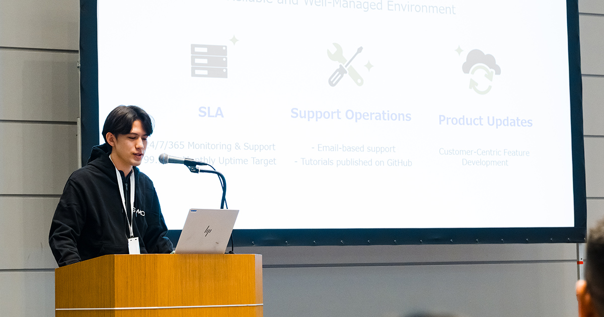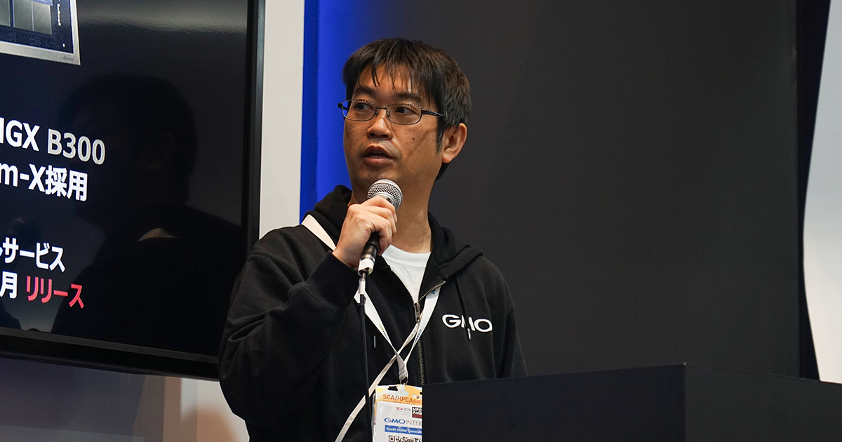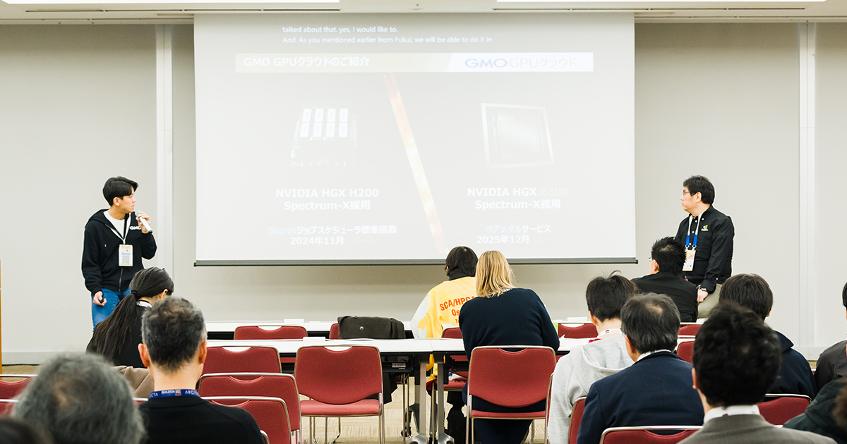 NVIDIのエンタプライズ マーケティング部 シニア マーケティング マネージャ 愛甲 浩史様とGMOインターネットのシステム本部 仮想化・共用技術チーム 大川 将史による共同セッションを実施しました。GMOインターネット・大川は「HPCのクラウドサービス化に向けた挑戦 ~ジョブスケジューラへの飽くなき追及~」をテーマに、GPUクラウド基盤における技術的な取り組みを紹介しました。また、NVIDIA・愛甲様からは「HPCをクラウド環境で実行するメリット・デメリットについて」解説が行われました。両社の知見を通じ、HPCおよびAIを実務で活用できるクラウドとして提供する「GMO GPUクラウド」の強みが示されるセッションとなりました。